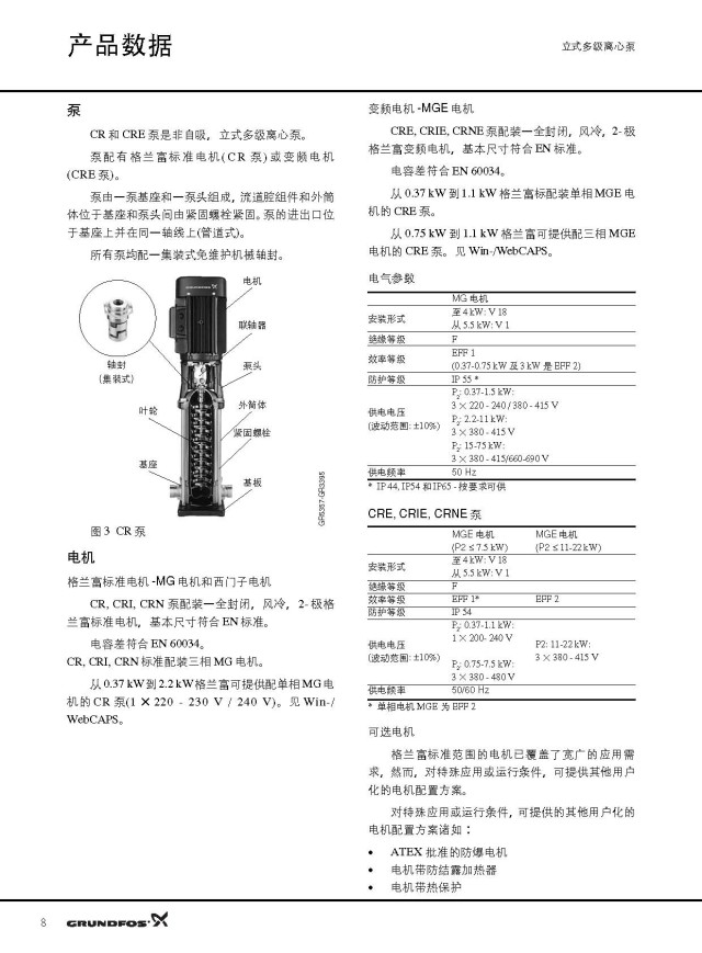 基本 CR 泵系列有四種材質(zhì):鑄鐵+304不銹鋼型,全304不銹鋼型,全316不銹鋼型和全鈦型。 該系列泵有11種型號,可產(chǎn)生高達50巴的壓力,軸密封件、橡膠材料和供電電壓具有多種選擇。